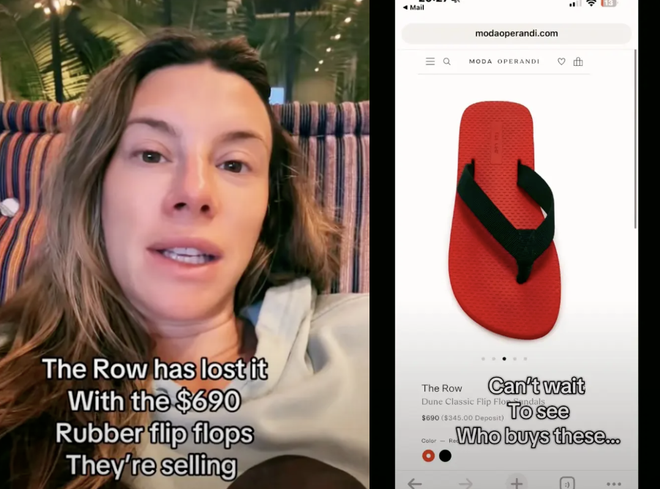朴素的橡胶拖鞋一朝踏碎朴素的价值观,The Row人字拖自推出以来,在外网上就是腥风血雨黑红体质。无数场论辩在TikTok等社交平台展开,核心问题就一个:到底谁在买?