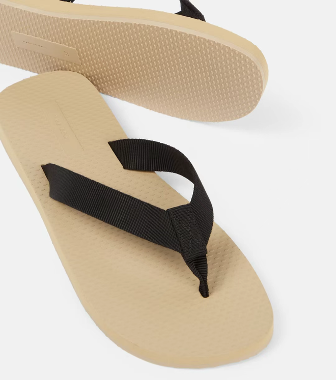 大牌们如今都爱揪着面料高谈阔论,而这双鞋从面料上看,仍然是一双普通人字拖:鞋底不是金子打的,是合成橡胶,鞋面“人”字不是玉带,是混纺——66%棉、34%粘胶纤维,后者是一种产量不算小、价格不太高的化纤,广泛应用于服装领域。