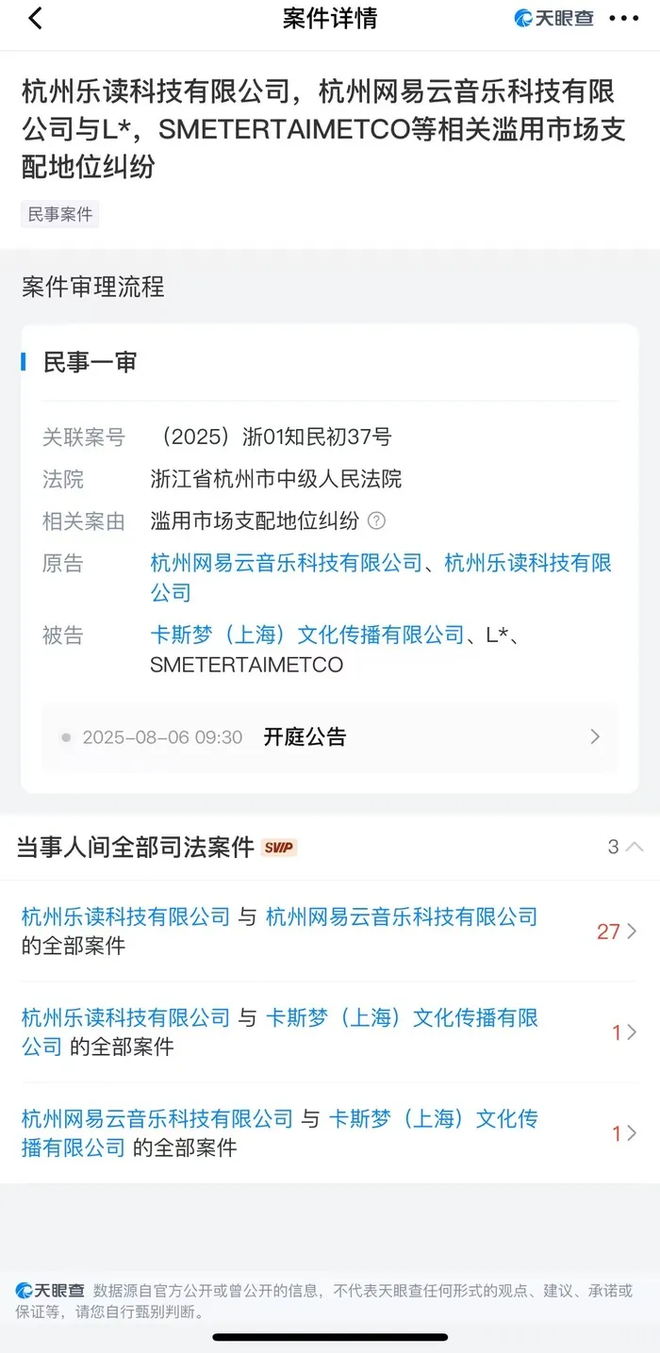 7月31日,“网易云音乐起诉韩国SM娱乐”冲上微博热搜。天眼查信息显示,该案系“SM滥用市场支配地位纠纷”。