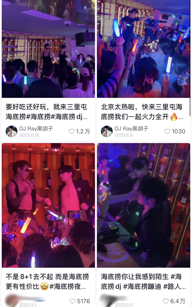 相比其他城市,北京还是太保守了。在网友分享的现场视频里,首家夜店海底捞广州店的DJ将夜店风践行得更加彻底,比如直接抱起女食客、用嘴喂樱桃等节目轮番登场。或许是为了保存体力,因为DJ要再接着赶场,当晚我刷到这位敬业的小哥,在真正的夜店直接光膀子演出。