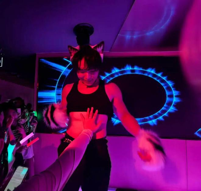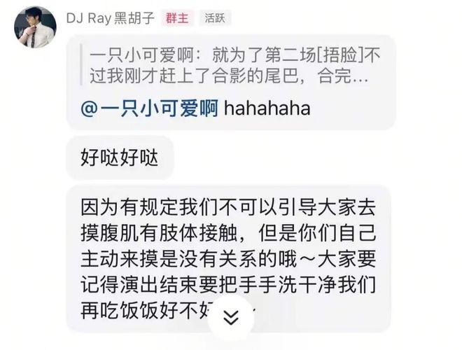 或许是小哥也在体谅台下的金主们等待一夜的辛苦,也或许跳了一夜太热担心中暑,小哥们开始对着人群撩起上衣展示自己的腹肌。“有规定我们不可以引导大家去摸腹肌有肢体接触,但是你们自己主动来摸是没有关系的哦”,这是当晚演出结束后DJ黑胡子Ray在抖音群里的分享。