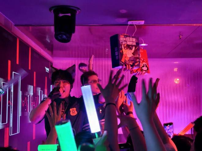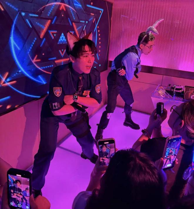 店里照明灯关掉,黑夜被五颜六色的霓虹灯照耀,举着手机的都市男女看向彼此、看向门口。直到两位穿着制服,cos疯狂动物城,带着兔子和狐狸耳朵尾巴的DJ小哥上场,就是有点狼狈,他们也得像沙丁鱼一样挤过来、挤过去再穿过厚厚的人群。