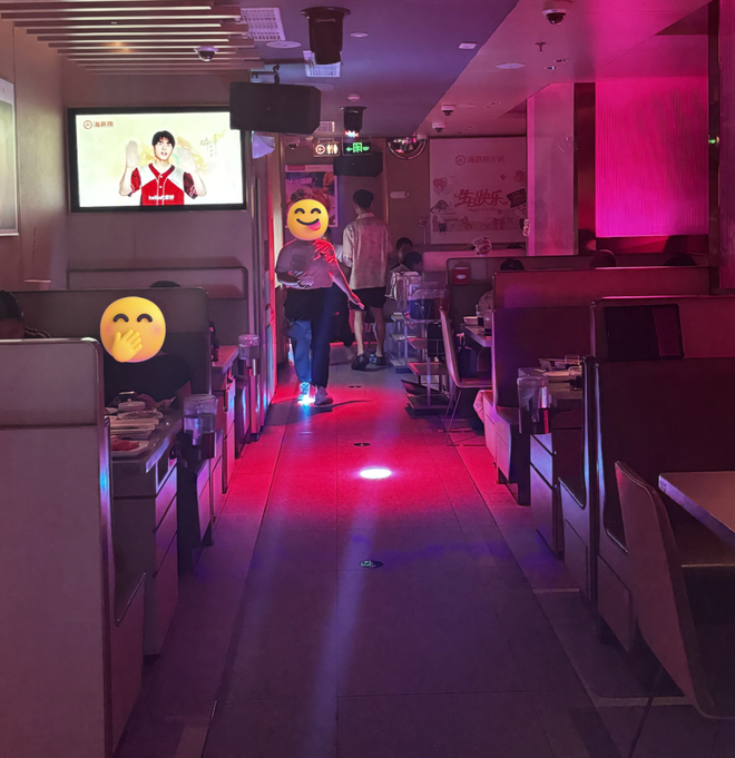 每当夜晚降临,海底捞的颜色就会变得不一样。白日亮堂明黄主打温馨路线,到了晚上9点40(不同门店时间不同)氛围灯一打开,全店进入夜店模式:
