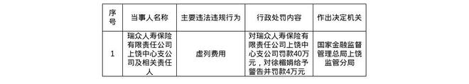 瑞众人寿上饶中支被罚40万,涉虚列费用