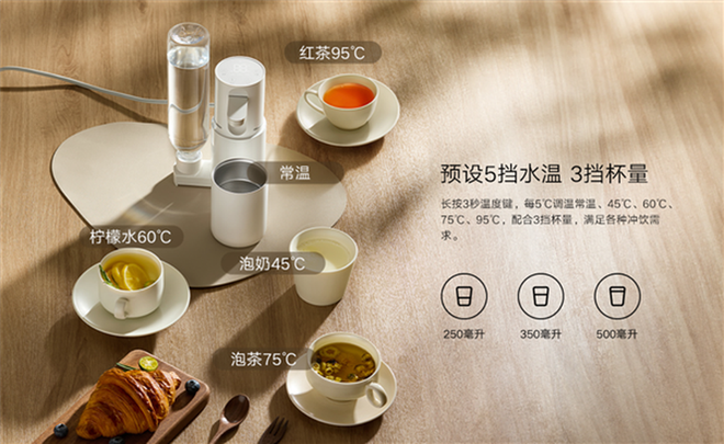 这款即热饮水机的核心亮点在于其自研复合精瓷加热技术,能够在3秒内快速加热水至所需温度。它还提供5挡预设水温(常温、45℃、60℃、75℃、95℃),以及每5℃可调功能,能满足泡奶、冲茶、泡柠檬水等多种需求,使用起来更加灵活便捷。