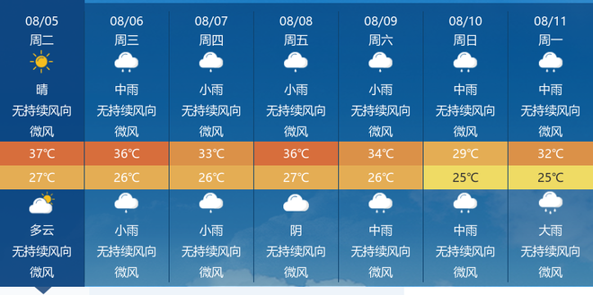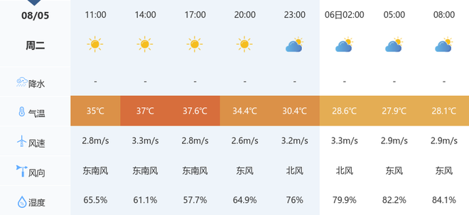 今天是2025年8月5日,宜昌天气白天为晴,夜晚为多云,白天微风,夜晚微风,最高气温37℃,最低气温27℃,空气湿度72%,体感温度38.0℃。高温高湿天气下,请注意避免长时间户外活动,做好防暑降温措施,及时补充水分,注意用电安全,防范高温导致的用电负荷过载。