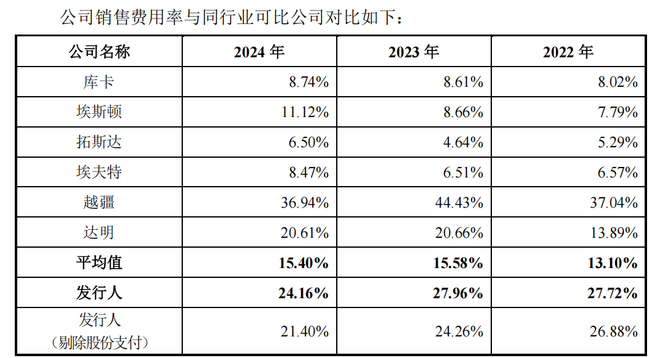 2022年至2024年,节卡股份的销售费用一直高于研发费用,分别为7782.04万元、9775.26万元及9674.36万元,占当期营业收入的比例分别为27.72%、27.96%及24.16%。