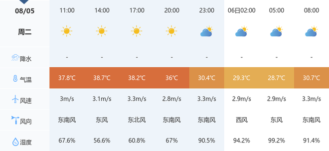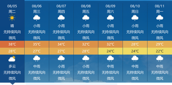 今天是2025年8月5日,随州白天天气为晴,夜晚天气为多云,最高气温38℃,最低气温28℃,空气湿度80%,体感温度37.1℃,空气质量良。白天微风,夜晚微风。建议相关部门做好高温防暑工作,户外作业人员注意适当休息,多补充水分,避免中暑。