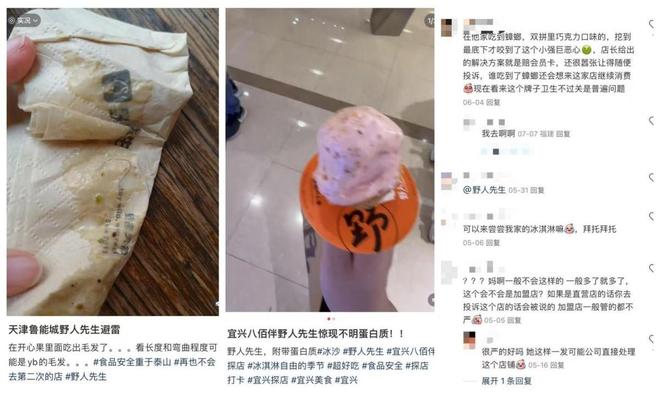 值得一提的是,野人先生还多次出现食品安全问题。多位网友在小红书发帖称,"吃出毛发","惊现不明蛋白质","吃到蟑螂"。