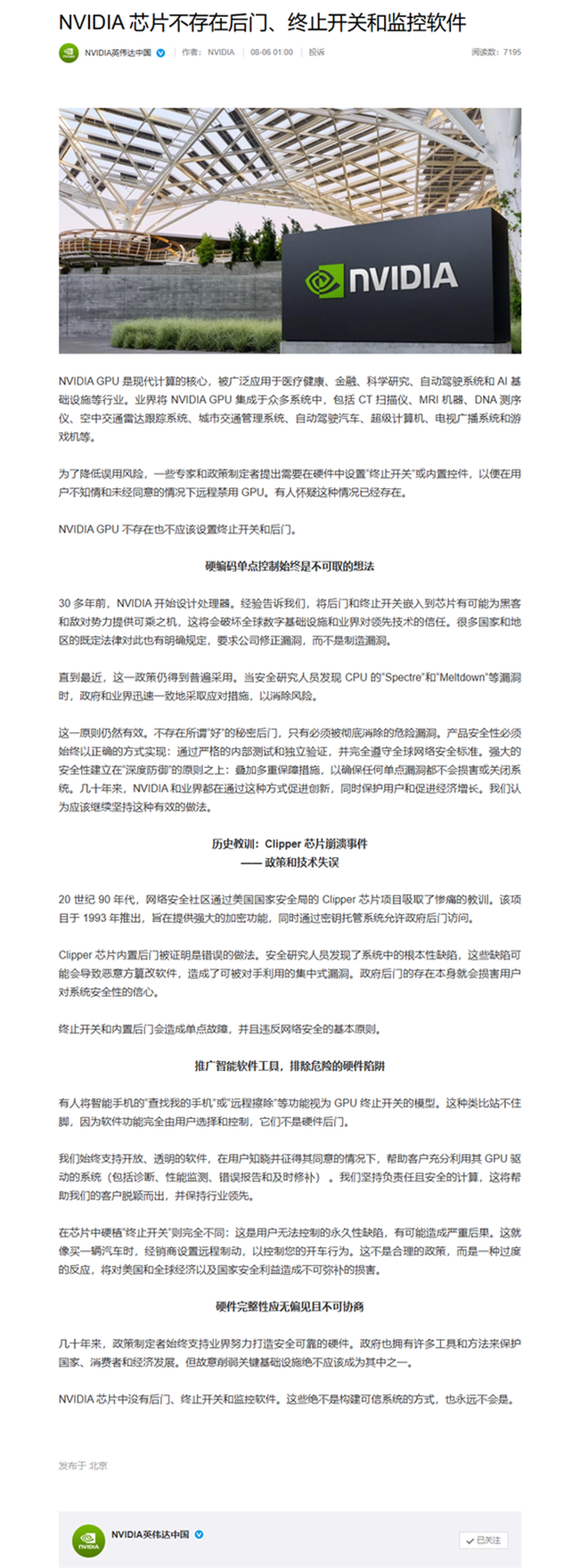 与智能手机的“查找我的手机”或“远程擦除”等功能相类比,英伟达指出,这些功能完全由用户选择使用,且可随时控制,并不等同于硬件后门。芯片中的“终止开关”则是永 久性的控制,用户无法撤销或干预,且可能带来严重的后果,远非合理的安全措施。