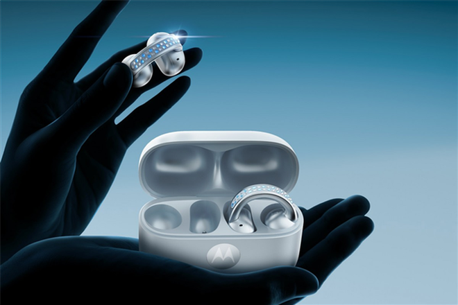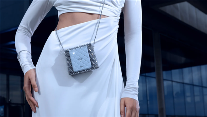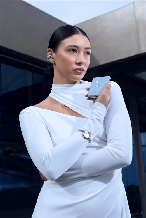 除了华丽的外观,moto razr 60还配备了独特的水晶风格音量键,并附赠一个透明斜挎保护包,方便用户展示这款设计感十足的折叠屏手机。与此同时,moto buds loop无线耳机也与手机一同推出,耳机同样镶嵌了施华洛世奇水晶,配备12毫米驱动单元,并经过Bose音效调校,支持空间音频,最长可提供37小时的续航时间。