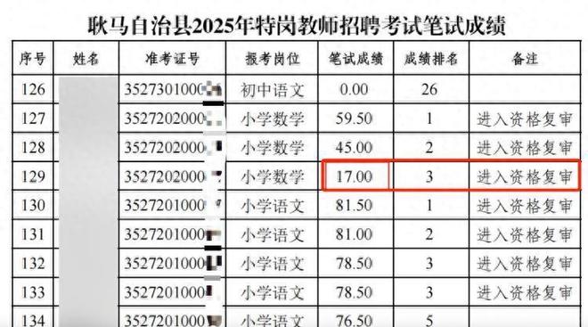 近日,云南临沧市耿马县2025年特岗教师招聘笔试成绩公布,其中一名报考“小学数学”岗位的考生笔试成绩仅17分进入资格复审,此事引发热议。