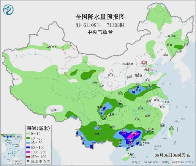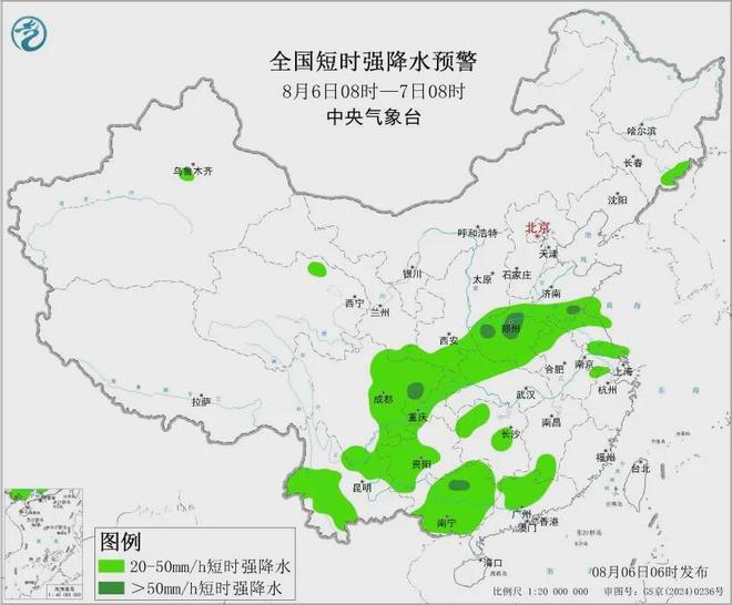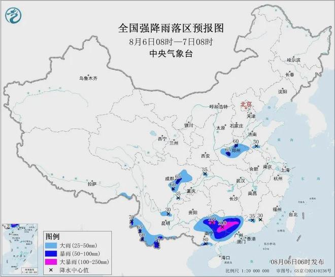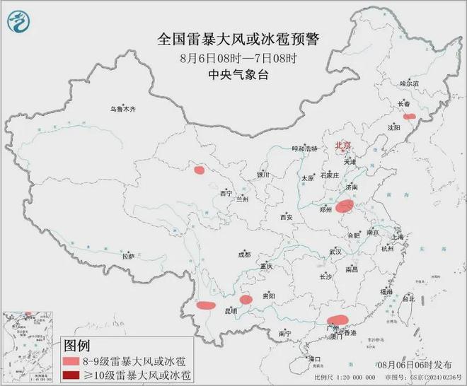 其中,8月6日8时至7日8时,广东北部和西部、广西中东部和南部沿海、湖南南部以及云南南部和西部、四川盆地西部、河南中部等地部分地区有大到暴雨,其中,广西东部、广东西北部等地部分地区有大暴雨(100至200毫米),上述部分地区伴有短时强降水(最大小时降雨量20至50毫米,局地可超过70毫米)。东北地区中部、西北地区中部、黄淮中部、西南地区南部、华南中部等地的部分地区将有8级以上雷暴大风或冰雹天气。