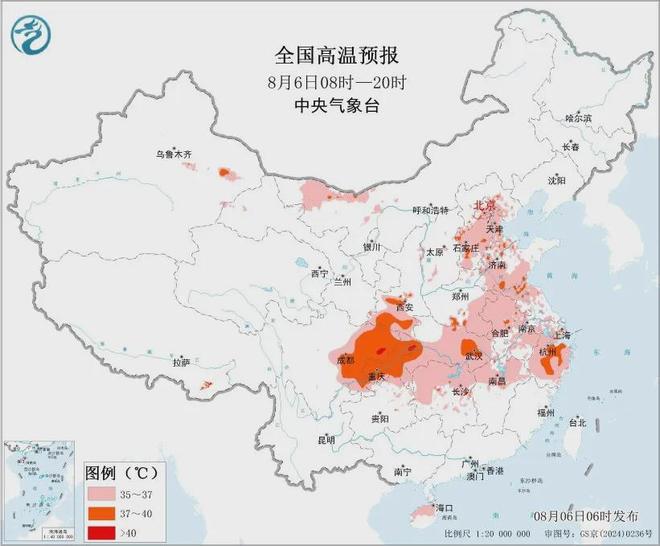 昨日,黄淮、江淮西部、江汉、江南中北部、四川盆地及河北南部、陕西南部、贵州东部等地出现35℃以上高温天气,四川东部、重庆、湖北西部等局地40~43.4℃。预计今天白天,中东部的高温将有所减弱,华北东部、陕西中南部、黄淮南部和东部、江汉、江淮、江南北部、四川盆地等地部分地区有35℃以上的高温天气,37℃以上的高温范围较昨日明显缩小,其中,四川盆地东部局地最高气温可达40℃以上。中央气象台8月6日06时继续发布高温黄色预警。