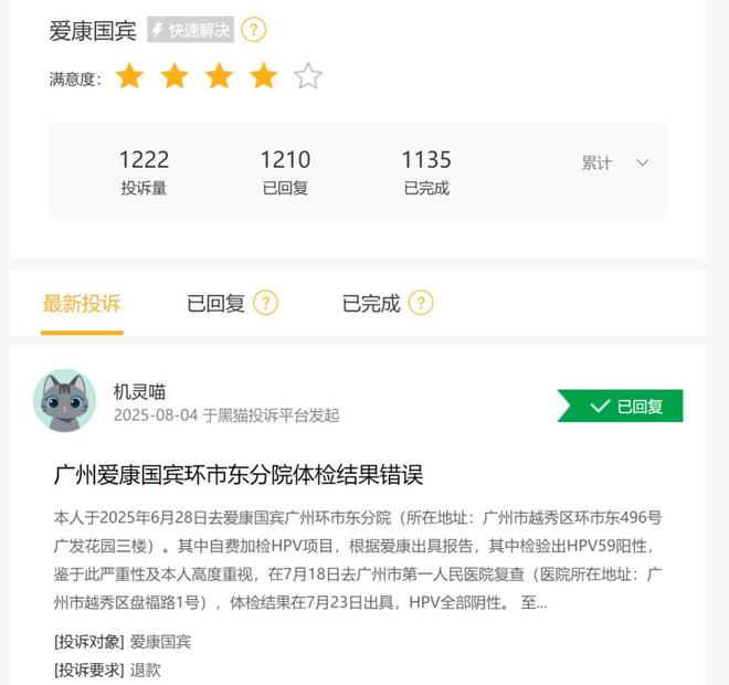 张某某的遭遇或非个案。据黑猫投诉平台数据,截至2025年8月,涉及爱康国宾的投诉已达1222条,其中不乏“体检报告错误”“漏检误诊”的案例。据媒体报道,一位常州消费者在爱康国宾4年3次体检未发现肾异常,2024年体检后一个月内确诊肾癌晚期,最终不幸离世。据黑猫投诉平台显示,8月4日广州一位用户投诉称把其HPV体检弄错,阴性呈阳性,后其高度重视后去医院检查确诊为阴性,给其心理造成创伤。