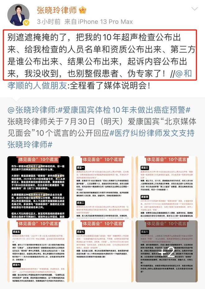 目前爱康国宾称已经向张某某提起诉讼,但张某某则称没有收到起诉,并要求爱康国宾把其在爱康国宾的十年超声检查公布出来,包括给其检查的人员名单和资质等。对此爱康国宾没有做出回应。