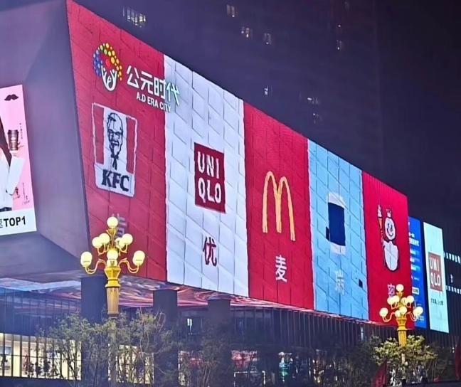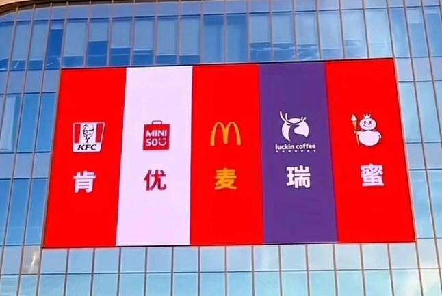 从武汉、太原到淄博、合肥,这些商场不约而同地将肯德基(肯)、优衣库(优)、麦当劳(麦)、瑞幸(瑞)和蜜雪冰城(蜜)的品牌标识组合成超大宣传图,以此作为吸引顾客的“黄金招牌”。