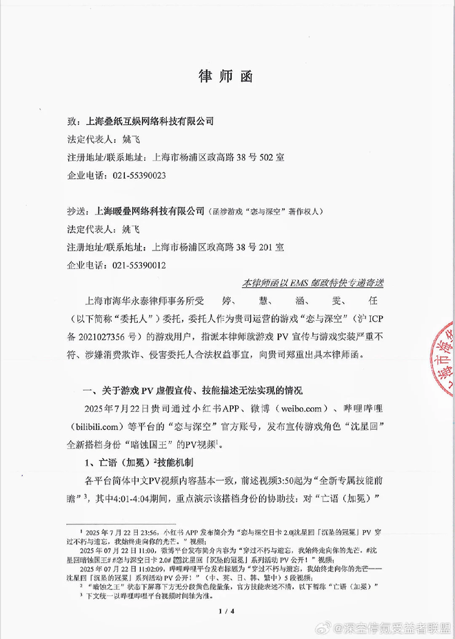 2025年7月,女性向手游《恋与深空》因活动“沈星回·暗蚀国王”涉嫌虚假宣传、诱导消费等问题,短短三天内收到超1500条投诉,玩家在“消费保”等平台集中维权。目前已有多人委托律师介入,矛头直指运营方上海叠纸互娱网络科技有限公司。8月初,有玩家正式委托律师向开发商上海叠纸网络科技有限公司发函,要求按照退一赔三原则补偿。