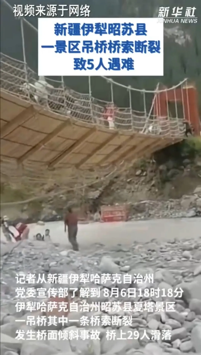 8月6日晚,新疆昭苏县夏塔景区将军桥发生桥索断裂,造成桥面倾斜,29名游客跌落,5人遇难、24人受伤(含2人重伤)。受伤人员均已送医救治,无生命危险。事故发生后,伊犁州与昭苏县应急部门迅速响应,现场救援、安抚和善后工作同步展开,景区已临时闭园,事故原因仍在调查中。