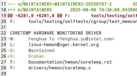 该补丁将俞峰华从 coretemp 硬件监控驱动程序维护者中移除,并将驱动程序状态从“已维护”改为“孤立”。