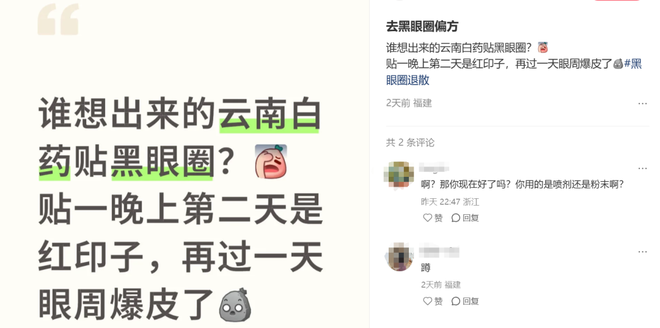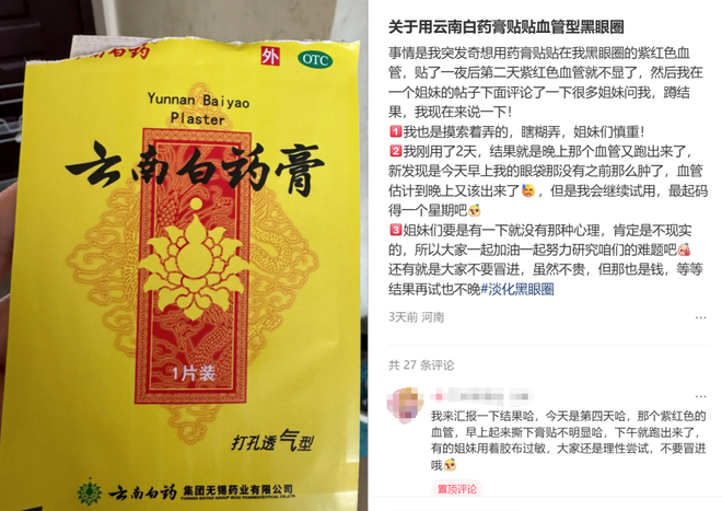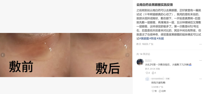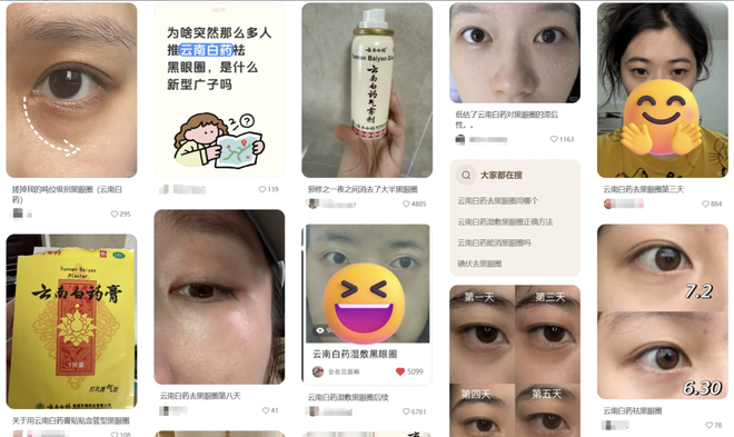 千元眼霜略失性价比,早睡早起来得太慢,可你一搜云南白药,短短几天就能“洗掉十斤黑眼圈”“用云南白药治理9年顽固黑眼圈”,网友的反馈一个比一个大胆。