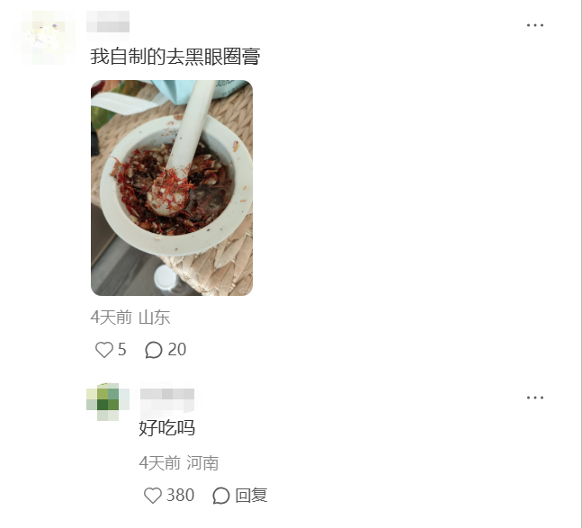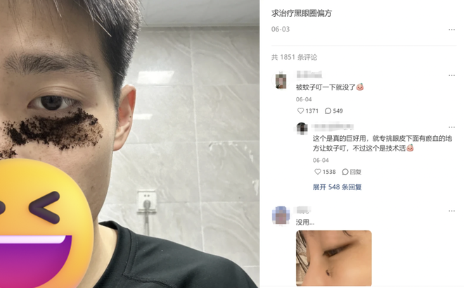 而其中最令人不解的,是有人发现黑眼圈被蚊子叮了个包后,居然被吸走了一半。但这种方法纯靠概率,看似幸运地被蚊子叮过一只眼的人,之后每天都在心心念念地等待蚊子叮上另一只眼,怎么不算一种错爱?