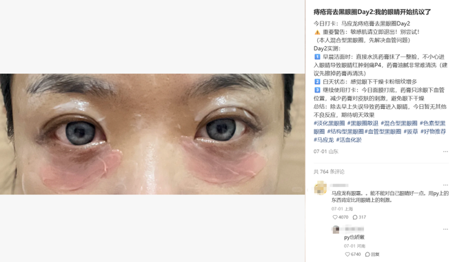 哪怕精确按照教程保持5毫米依旧熏眼睛,敏感肌敷完疼到第二天,还有人敷到长疹子半个月才消,“好几年还有色素沉着”。所有教程都会友情提醒,需要先涂在耳后测一测是否过敏。