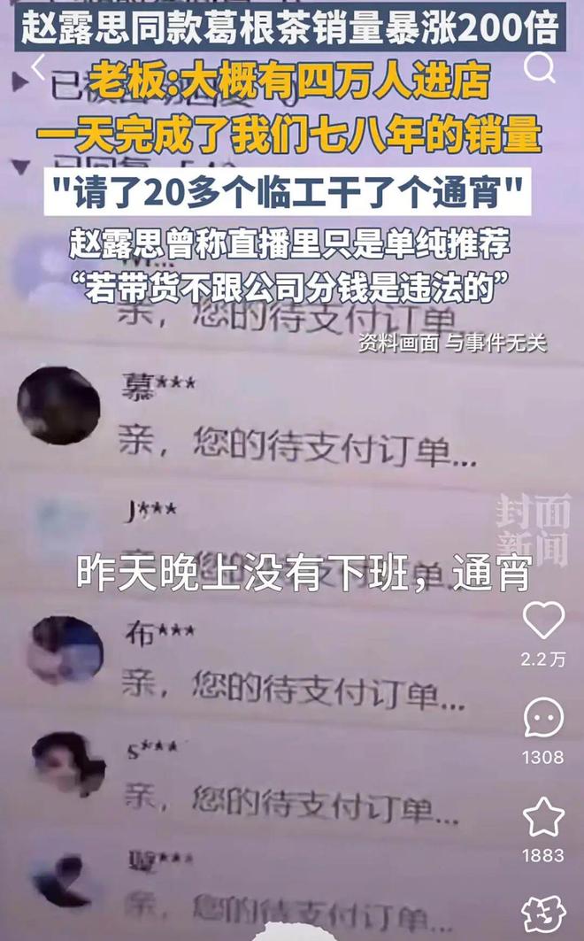 同样一夜成名的还有葛根茶。8月6日,赵露思在直播里展示了一款四川广元产的葛根茶,提到“助肝排毒,自己喝了一段时间”。粉丝们看到以后忘情了、发狠了,一夜之间进店疯狂扫货,店铺销量从原本的几十单涨至2000多单,商品下架、老板忙得团团转。