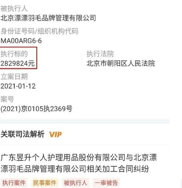 但转年到2020年的时候,代工厂昱升就起诉漂漂羽毛拖欠加工款了,疑似资金链断裂。