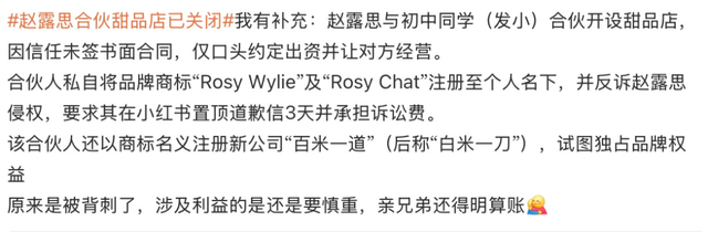 但很快问题就来了,合伙人不但私自将品牌商标“Rosy Wylie”及和关联商标“露思の甜”注册至个人名下,同步反诉赵露思侵权。