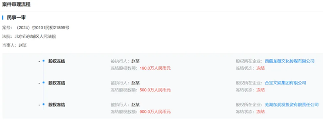 她所持的三家公司股权被冻结——西藏龙薇文化传媒190万元(持股95%)、合宝文娱集团500万元(持股4.51%)、芜湖东润发投资900万元(持股90%),总额1590万元,冻结期均为三年。