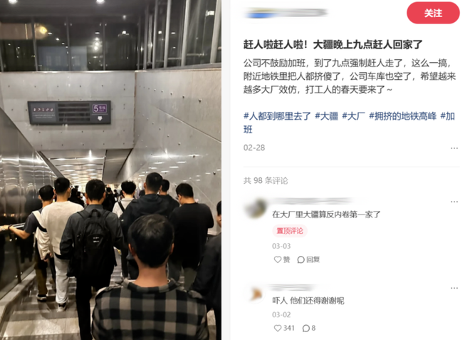 据媒体报道,2月27日,大疆各个部门的HRBP准时在晚上9点到各楼层赶人下班。被“强制下班”打工人像消防演练一样在几分钟内被“疏散”。对于不肯走的人,HR会亲自到工位上“关心”,劝他们下班,有人一周被HR“关心”了三次。