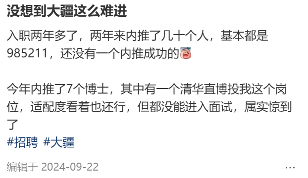 在所有科技大厂里,大疆对员工的选拔标准以“极高”闻名。大疆的产品经理面试难度被称为“地狱级”,等待面试的毕业生说自己“紧张到手脚发凉”。有人入职了大疆两年,内推了7个博士,但没有一个人进入面试。大疆或许是唯一一个,当你搜索“面试”时,满屏只能看到“凉经(失败经验)”的公司。每年秋招,“被大疆选中”是应届毕业生的至高荣耀。