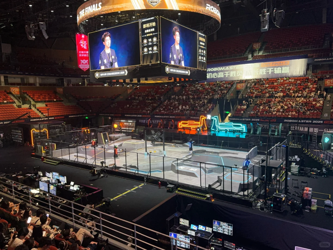 比赛内容相当科幻:每个学校的战队带着自己研发的机器人在场地里进行射击对抗,最终目标是推倒对方的基地。