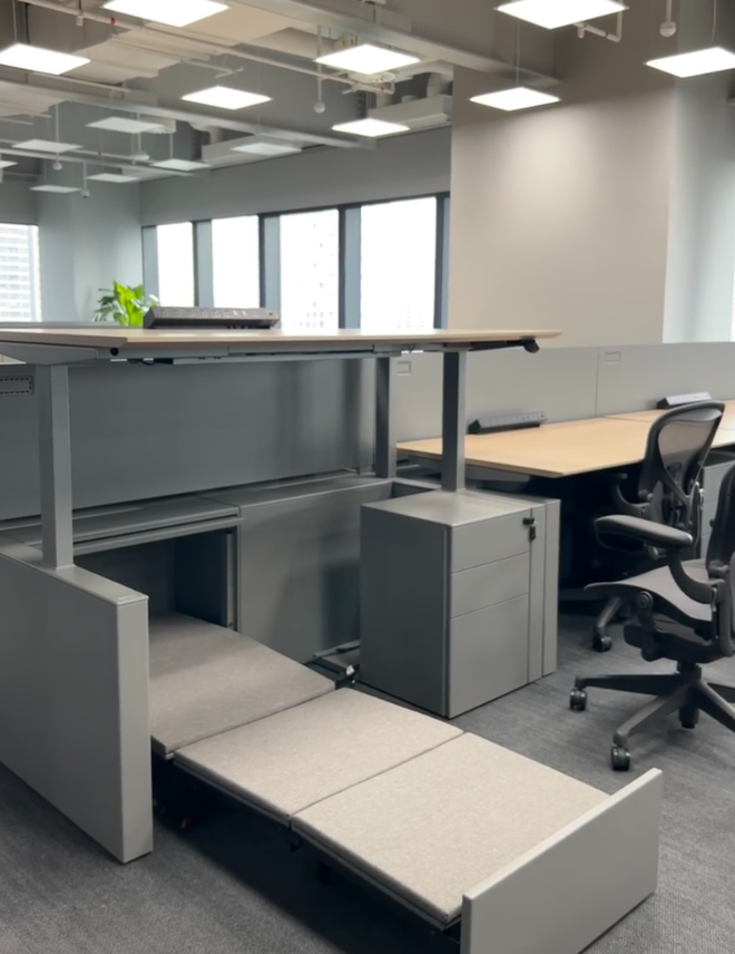 大疆给每个员工的工位上配备了一张可以从桌子底下拉出来的单人床。通常员工们用这张床午睡,但显然床的存在让通宵加班变得更加顺理成章。
