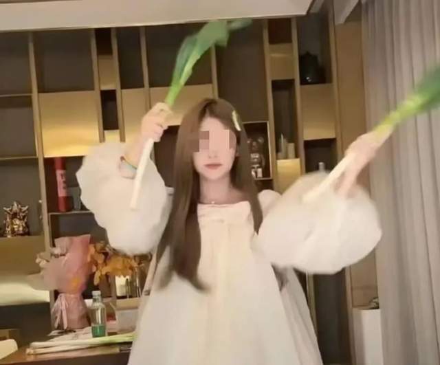 在女儿脸上用大葱特效,拿着大葱直播,在带货的零食里全是洋葱圈、香葱鸡片、葱油拌面和葱油饼......都有“葱”这个字。
