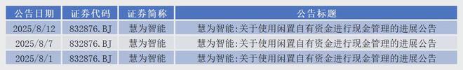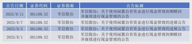 以军信股份(301109.SZ)和慧为智能(832876.BJ)为例,两家公司“密集”披露关于使用闲置自有资金进行现金管理的进展公告。
