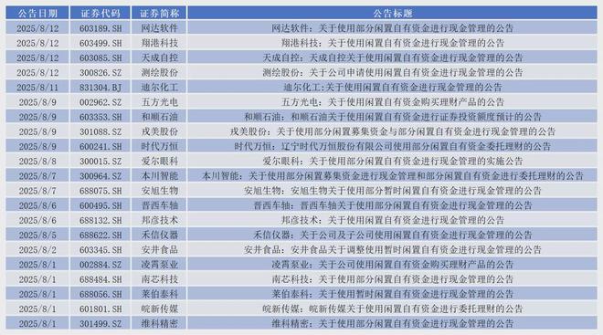 仅8月以来,就有65家上市公司发布80个闲置自有资金管理相关公告,其中大部分是进展公告。