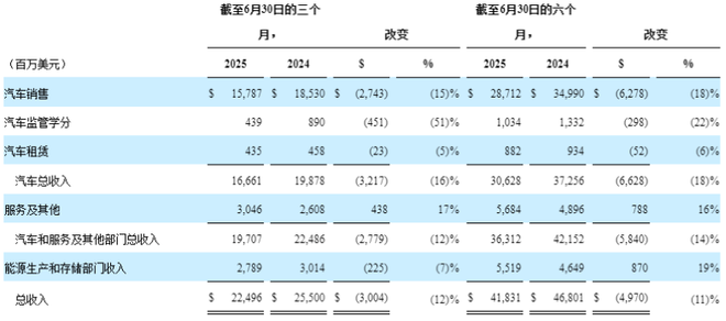 分业务来看,二季度特斯拉汽车业务营收166.61亿美元,同比下降16%。其中,汽车销售业务收入为157.87亿美元,同比下降15%。从其他支付碳积分的汽车制造商处获得的收入为4.39亿美元,较上一年同期下滑超过50%。发电和储能业务实现营收为27.89亿美元,同比下降7%。其中,公司储能业务因受关税政策冲击,装机量已经连续两个季度同比下滑;包括充电网络、汽车维修、保险等业务在内的特斯拉服务及其他业务实现营收30.46亿美元,同比增长17%,成为本次财报中为数不多的亮点。