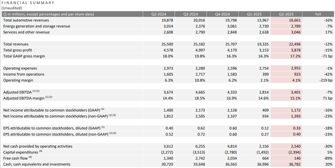 前不久,特斯拉发布了其2025年第二季度业绩报告。第二季度,特斯拉实现营收224.96亿美元,同比下降12%,低于市场预期的226亿美元,并创下2012年来最大单季降幅;实现净利润11.72亿美元,同比下降16%,市场预期为11.36亿美元;自由现金流为1.46亿美元,较第一季度(6.64亿美元)环比下滑超过5亿美元。毛利率方面,特斯拉毛利率从去年同期的18%降至17.2%,各项财务指标几乎全线下滑。