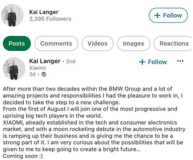 近日,凯·兰格通过领英平台宣布,已于8月1日正式加入小米公司。凯·兰格在声明中表达了对小米的赞许,他认为小米不仅在科技及消费电子产品领域根基稳固,其在汽车行业的首次亮相亦备受关注。小米作为“全球最具进步性和崛起势头的大型科技公司之一”,为他的职业发展提供了新的平台。