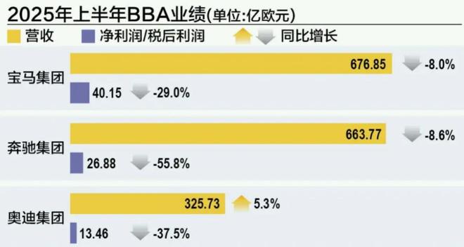 宝马上半年营收676.85亿欧元,同比下降8%,净利润40.15亿欧元,同比下滑29%,宝马完成了对奔驰的营收超越,2024年宝马营收1423.8亿欧元,同比下滑8.4%;奔驰营收为1456亿欧元,同比下降4.5%,奔驰领先宝马32.8亿欧元。但8%的下滑也显露颓势,奔驰营收则以同比下滑8.6%录得三家中最大跌幅,净利润暴跌55.8%,腰斩过半。奥迪成为BBA中唯一一家营收增长的车企,上半年营收325.73亿欧元,同比增长5.3%,只是其营收规模依然在BBA中垫底,不足宝马和奔驰的一半,其13.46亿欧元的净利润同样下滑了37.5%,净利润约为宝马的三分之一,奔驰的一半,增收不增利。