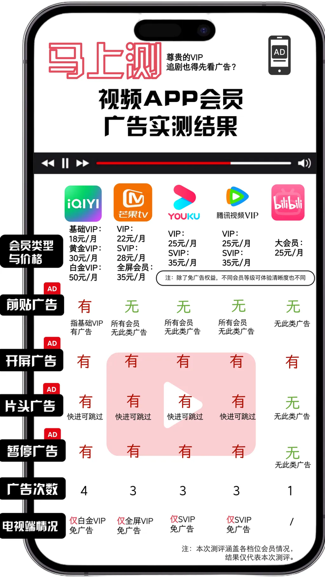 近日,澎湃新闻实测芒果TV、优酷、爱奇艺、腾讯视频、哔哩哔哩五款视频平台发现,即便开通VIP或SVIP,也只是免掉部分前贴片广告,暂停广告、植入广告、开机广告等十几种广告仍可能出现,部分无法关闭。部分平台手机端和电视端会员权益不互通,还存在多级会员“套娃式”收费,想要完全免广告需要持续加钱。