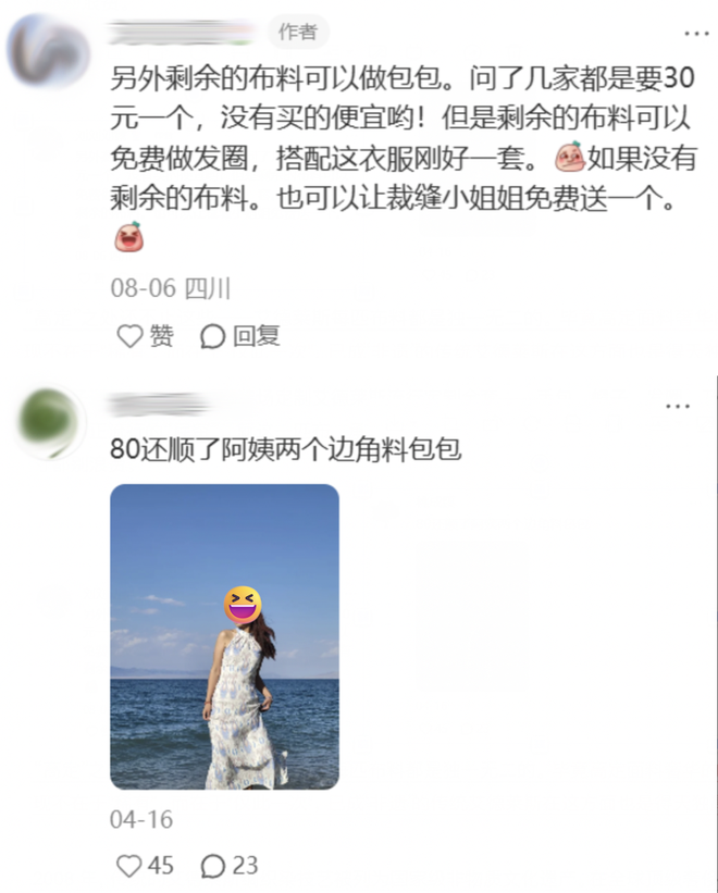 对于游客群体,“来都来了”是强驱动力,买身特色服饰拍照留念是主要目的,能体验一下现场量体裁衣就算收获新奇,最后一合计,一条裙子加余料裁的包算上手工费才一百大几,穿脏了还能直接机洗,实在是实惠至极。