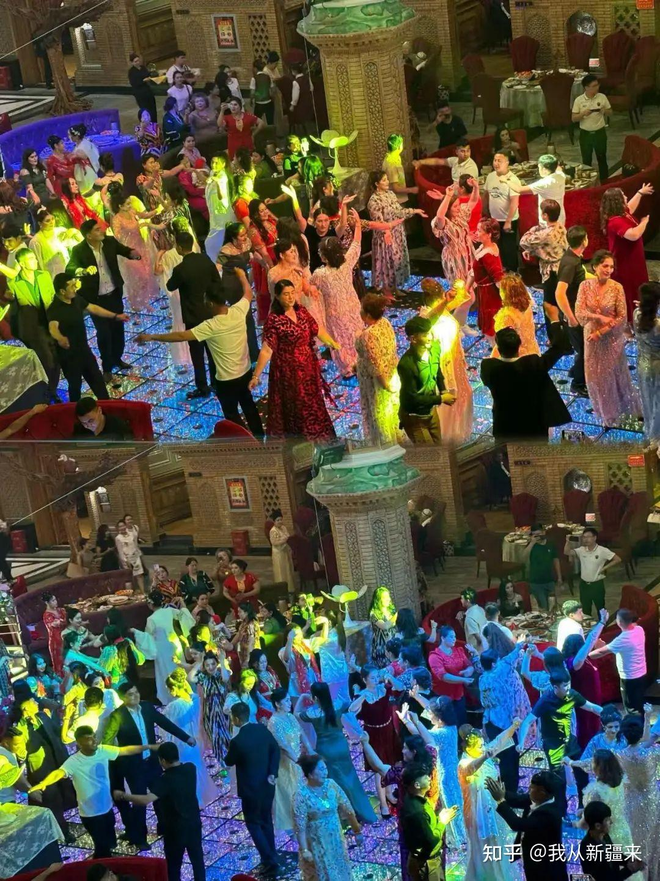 一般婚礼,宾客只等开席抢烧鸡,维族婚礼,吃饭只是休息。重头戏是在恢弘华丽的宴会厅里、耀眼夺目如迪斯科灯球的彩光下,全员穿着精美礼服起舞。非常优雅,非常热烈,你说这是格莱美颁奖仪式后的派对我都信。