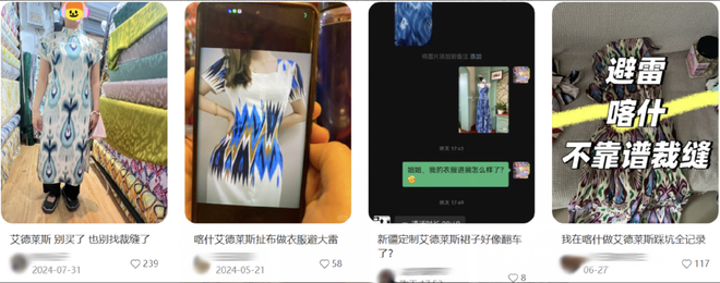 所以在旅游攻略里被封为“最划算高定”的到底是什么?很大一部分是我们最熟悉的化纤,印上了我们尚不熟悉的艾德莱斯纹样,被称为“艾德莱斯印花”。据蔡羽涵了解,“艾德莱斯印花”常常来自杭州一带的布料商。
