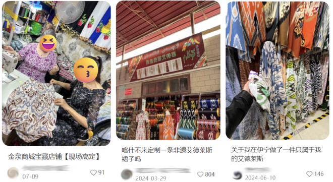 如今把新疆服装城捧成热门景点的游客,把艾德莱斯买成了高定平替——时间是不用那么久的,价格是不用那么贵的,一对一服务和独一无二成品,则是打包奉上的。