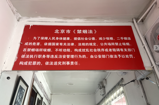 推开门就是洗手台,镜子上方高悬着对北京市《禁烟法》(正式名称为《北京市控制吸烟条例》)的普法介绍,结尾一句“依法追究刑事责任”颇具压迫感。