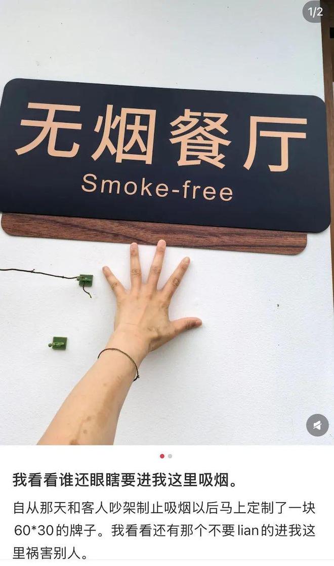在那之后,她又额外定做了一块宽60厘米长30厘米的“无烟餐厅”牌子,明晃晃地挂在了门口,“我看看谁还眼瞎要进我这里吸烟”。