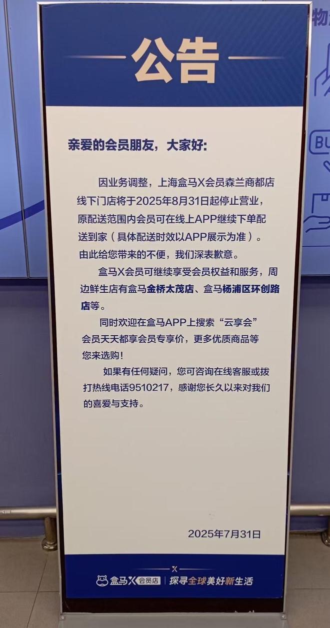 7月29日,盒马X会员店北京世界之花门店的公告显示,该店在7月31日停止营业;同在7月31日,盒马X会员店的苏州相城店、南京燕子矶店也停止营业。